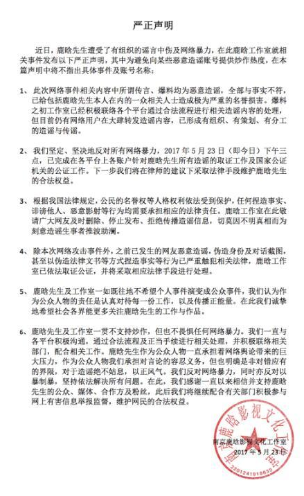 对于鹿晗工作室的声明,原文表示对之前发生的网友恶意造谣,伪造身份对话截图等已经依法取证公证,并将采取相应的法律手段进行处理,并晒出了律师函进行法律维权。