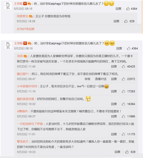 尽管去年李世石与阿法狗大战时,柯洁发表了很多年少轻狂的言论,当时受到很多质疑,但如今他敢于人机大战,其精神就可嘉。因此对于王思聪对柯洁的质疑,网友不干了,纷纷发言为柯洁出头,“不嚣张能吸引你这种棋盲来关注围棋?王公子不知道你对人工智能和围棋的了解程度有多少?”还有网友回应王思聪:“柯洁就一点比你强,能力之外资本为零。所以我是他的粉,不是你的。”还有网友直言王思聪不应该出现在体育界,“真以为自己投资出点成绩是自己本事,真当自己是根葱,你只适合娱乐界,智商界你不配评论。”