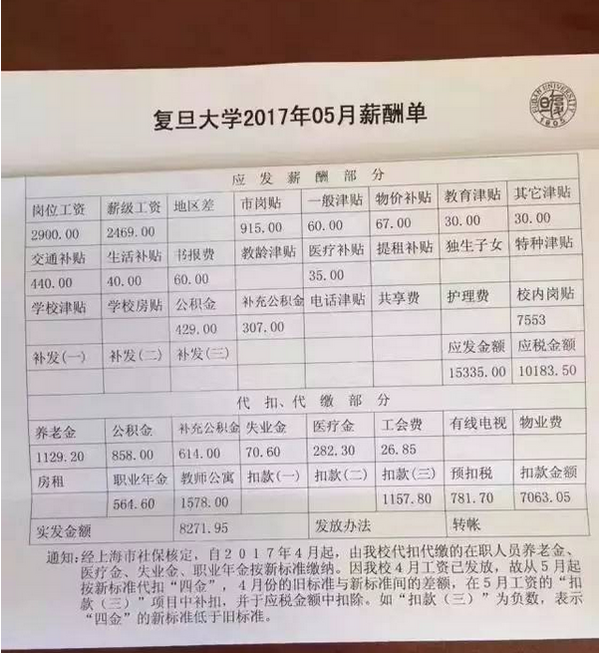 这两天,朋友圈转发一条消息:复旦大学某教授月工资应发15335元,但实际到手只有8272元,而且是薪酬总数,别的啥都没了!这份工资单引起了网友的热议。