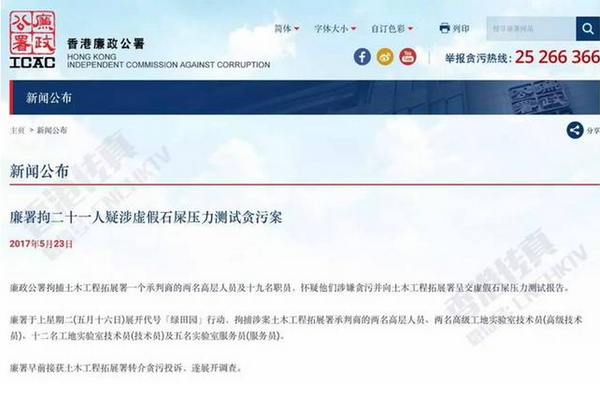 据香港《东方日报》网站5月24日报道,罪状包括将测试器材的显示时间推前,以“符合”规定;以强力水泥砖等代替水泥样本,伪造测试结果;有高级技术员涉贪污,将虚假测试报告呈交香港土木工程拓展署;而承办商进行内部调查时,高层人员又涉嫌误导和诈骗当局。