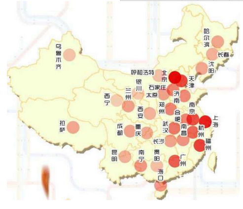 从图中可以看到,颜色越深的代表购房压力越大。北上广等一线城市购房压力最大。