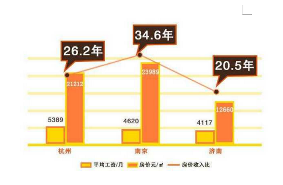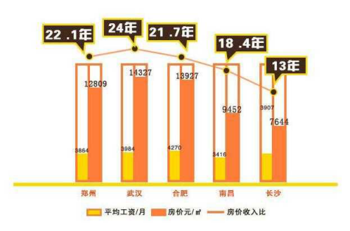 中部地区,郑州、武汉、合肥、南昌购房压力相近,基本在20年左右,长沙较少,需要13年。
