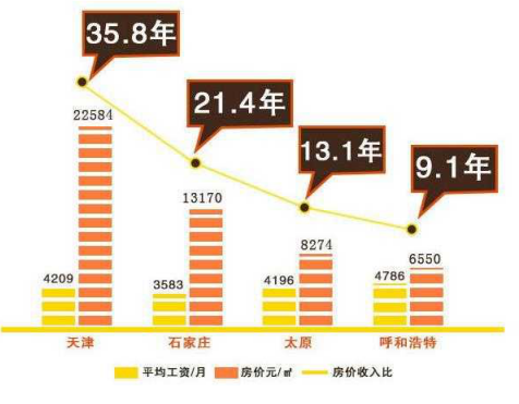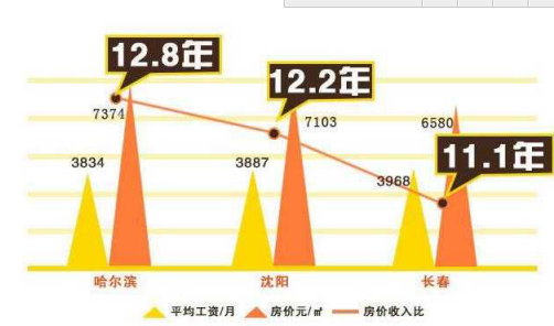 东北地区,购房压力相对均衡,哈尔滨为12.8年,沈阳为12.2年,长春为东三省购房压力最下城市为11.1年。