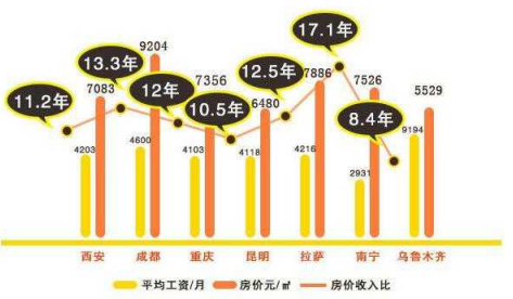 西部地区,相对来说购房压力不是很大,南宁由于收入水平较低,购房压力更大一些,其他城市基本都在12年左右。