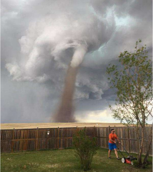 看下面这张照片,你就会发现。照片中淡定除草的男子身后是一个巨大的龙卷风。而这张照片是他的妻子塞西莉亚拍摄的。
