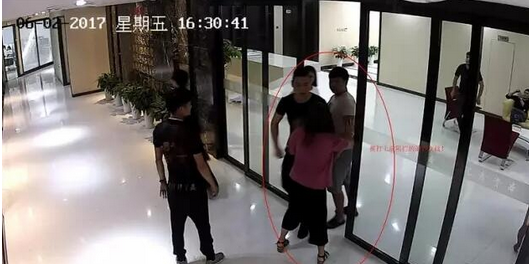 监控视频显示,一名面容较好的女子穿着黑色长裙、高跟鞋,戴着大墨镜,于6月2日16时27分进入涉案公司,身后紧跟着5名男子。进门时,该女子与2名男子去前台,另外几人坐在公司前厅的沙发上。随后,该女子离开前台双手背在身后,在前厅走来走去,不时向公司内的工作人员打招呼示意开门。16时30分,5男子中最纤瘦的一人从前台后面一处隔断中挤入办公区域,随后从内部打开门禁,该女子双手背在身后昂首进入办公区,身后2名男子紧跟她身后进入。前台人员试图阻拦,被一名男子一把推开,后面3男子留在前厅等待。16点38分,该女子带头走出办公区域,5男子跟着她离开公司。