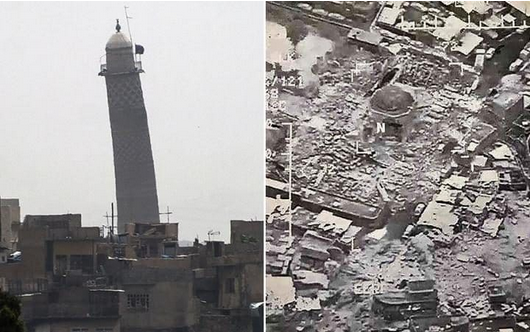 炸毁前与炸毁后的清真寺(图片来源:英国《每日电讯报》)