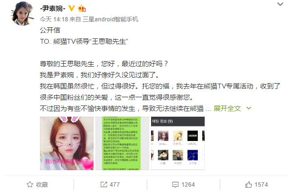 在公开信中,尹素婉表示因“有些不愉快事情的发生”而离开熊猫TV直播。她透露,熊猫TV的高层疑似炒作她与某公司签约2000万签约金的新闻,以此来增加王思聪公司的利益。