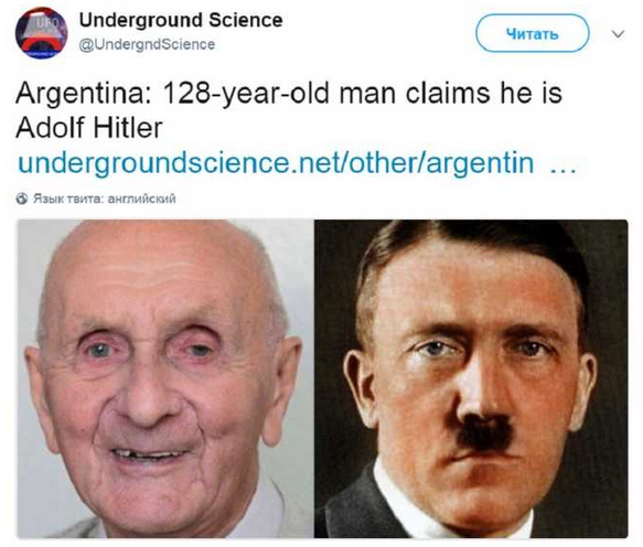 据俄罗斯卫星网6月29日报道,阿根廷萨尔塔市(Salta)一位据说已经128岁的老翁宣布,自己的真实身份实际上是纳粹前领袖阿道夫?希特勒,在过去的70年内一直在东躲西藏。虽然他的说法挑战了公众可信度的极限,但这种说法与阿根廷发现纳粹纪念品藏品的事实却是一致的。