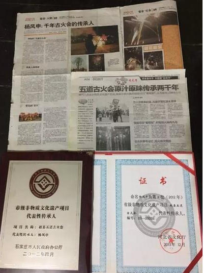 “五道古火会”主要组织正月十五的烟火表演,杨风申为该会会头,也是“五道古火会”第四代传人。